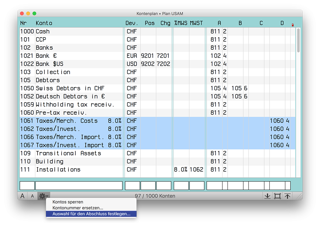 Um das Konto zu bestimmen, in welches andere Konten übertragen werden, aktivieren Sie die zu übertragenden Konten mit gedrückter Befehlstaste + Mausklick und wählen die Option « Auswahl für den Abschluss festlegen… » im Aktionsmenü am Fuss des Kontenplans (Zahnrad-Symbol) :