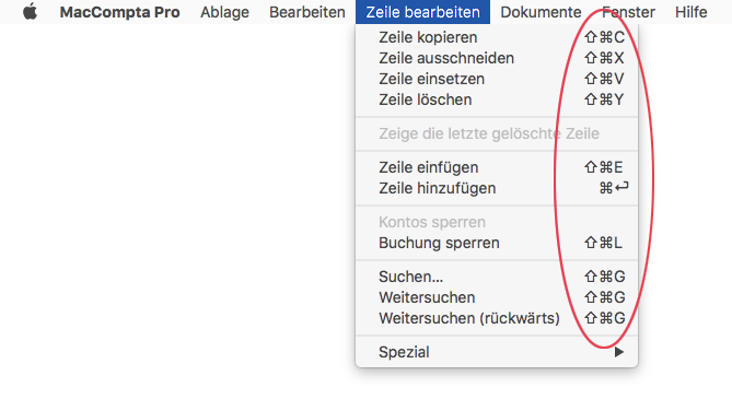 MacCompta erlaubt Ihnen auch, mit Tastenkürzeln zu arbeiten, die Sie neben jedem Befehl im Menü finden.