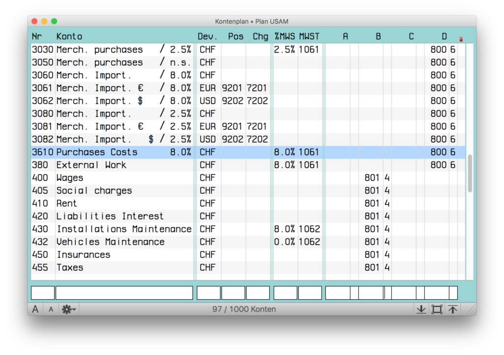 Jedes Konto kann demnach mittels Hinweis in einer der 4 Spalten im Kontenplan automatisch auf ein anderes Konto übertragen werden. Normalerweise verwendet MacCompta für die Reihenfolge der Übertragungen die Kontennummern. Indessen ist auch eine andere Form der Übertragungsfolge möglich, indem die an die Abschlusskonto angrenzende Spalte benutzt wird. Die Reihenfolge der Nummern reicht von 9 bis 1, wobei mit 9 markierte Übertragungen zuerst erfolgen.