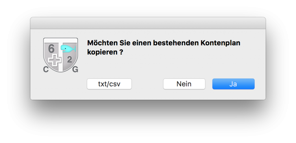 Um einen bestehenden Kontenplan zu übernehmen, klicken Sie beim Erscheinen dieses Fensters auf « Ja » und selektieren ein .cptp Datei. Möchten Sie eine tabelierte gültige .txt/csv Datei öffnen, klicken Sie auf txt/csv.