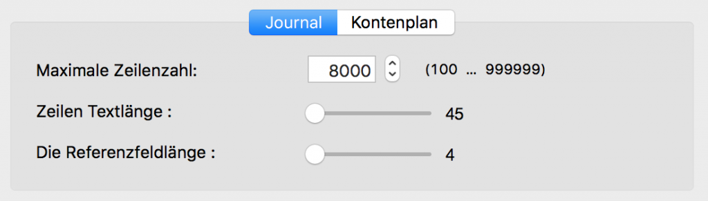Wenn das Journal Ihnen im Laufe des Jahres anzeigt, dass Sie die maximale Zahl der Buchungen erreicht haben, erhöhen Sie einfach die Zahl im Formatierungsfenster für Maximale Zeilenzahl.