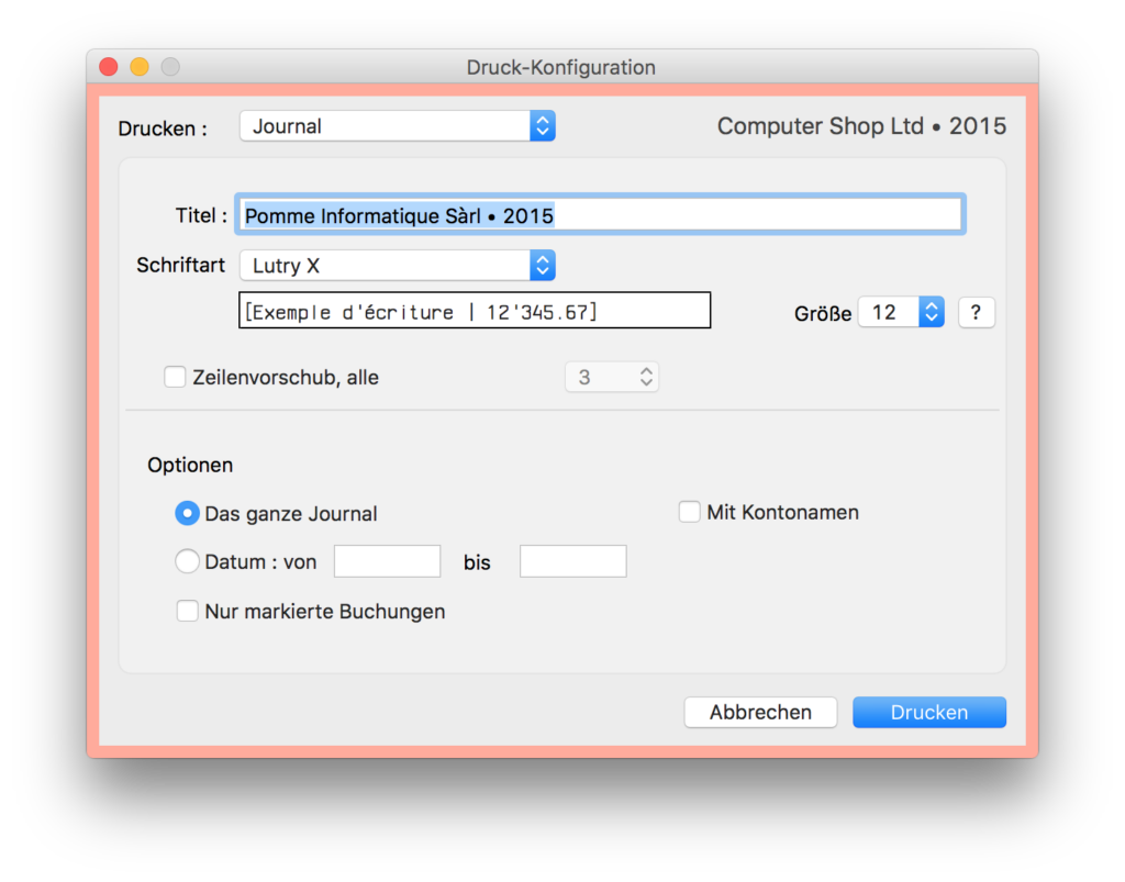 Eine erste Option für den Druck finden Sie unter « Drucken… » im Menü « Ablage ». Die Dialogmaske erlaubt Ihnen, den Druck des gewünschten Dokuments zu bestimmen.