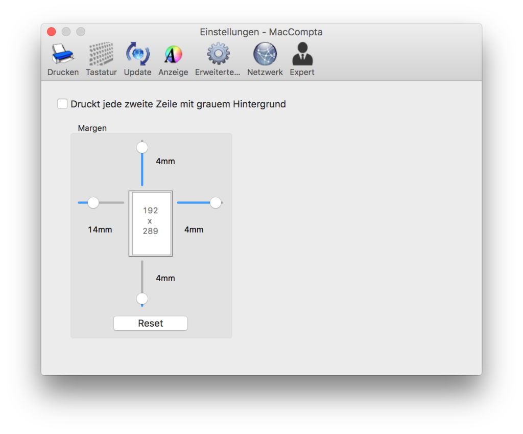 Sie können den Rand der Druckfläche oben, unten, links und rechts individuell festlegen. Im Menü « MacCompta Pro » unter « Einstellungen… » finden Sie eine Maske mit dem Symbol « Drucken ». Dort können Sie Ihre eigenen Einstellungen vornehmen, wobei wir empfehlen, mit einem Kontrollausdruck die Vollständigkeit der Informationen zu prüfen.