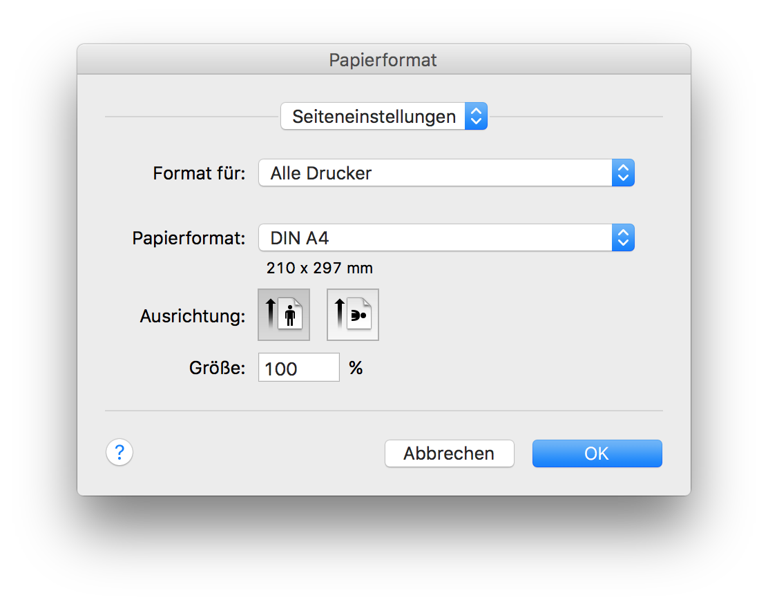 Sie können damit den Ausdruck im Hoch- oder Breitformat sowie dessen Grösse bestimmen. Angaben zu den anderen Optionen finden Sie im Handbuch des verwendeten Druckers.