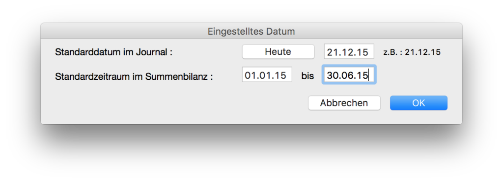 Im MacCompta Pro ist es möglich, die Summenbilanz über einen definierten Zeitraum unter Ablage > Datum Wechseln anzuzeigen.
