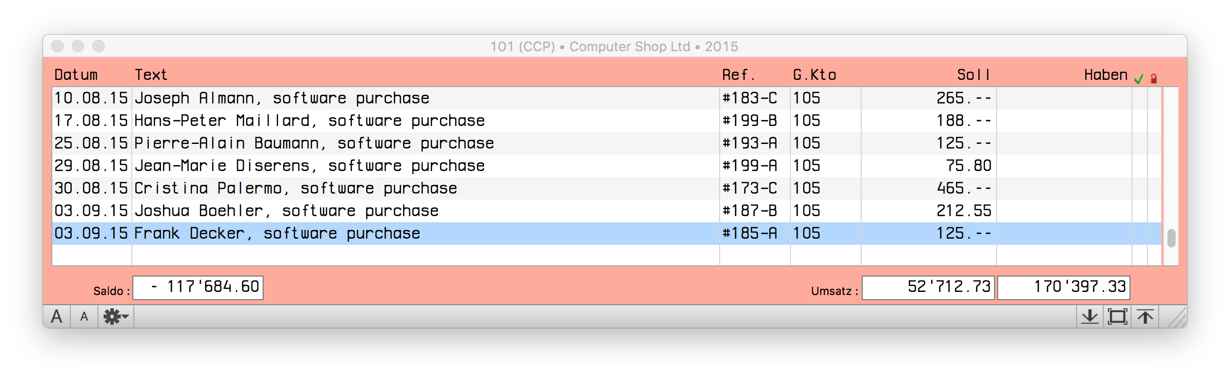 Auch in einem Konto selbst wird der Saldo bis zu einem gewünschten Datum durch Anklicken der Zeile und Halten der Wahltaste (alt) angezeigt.